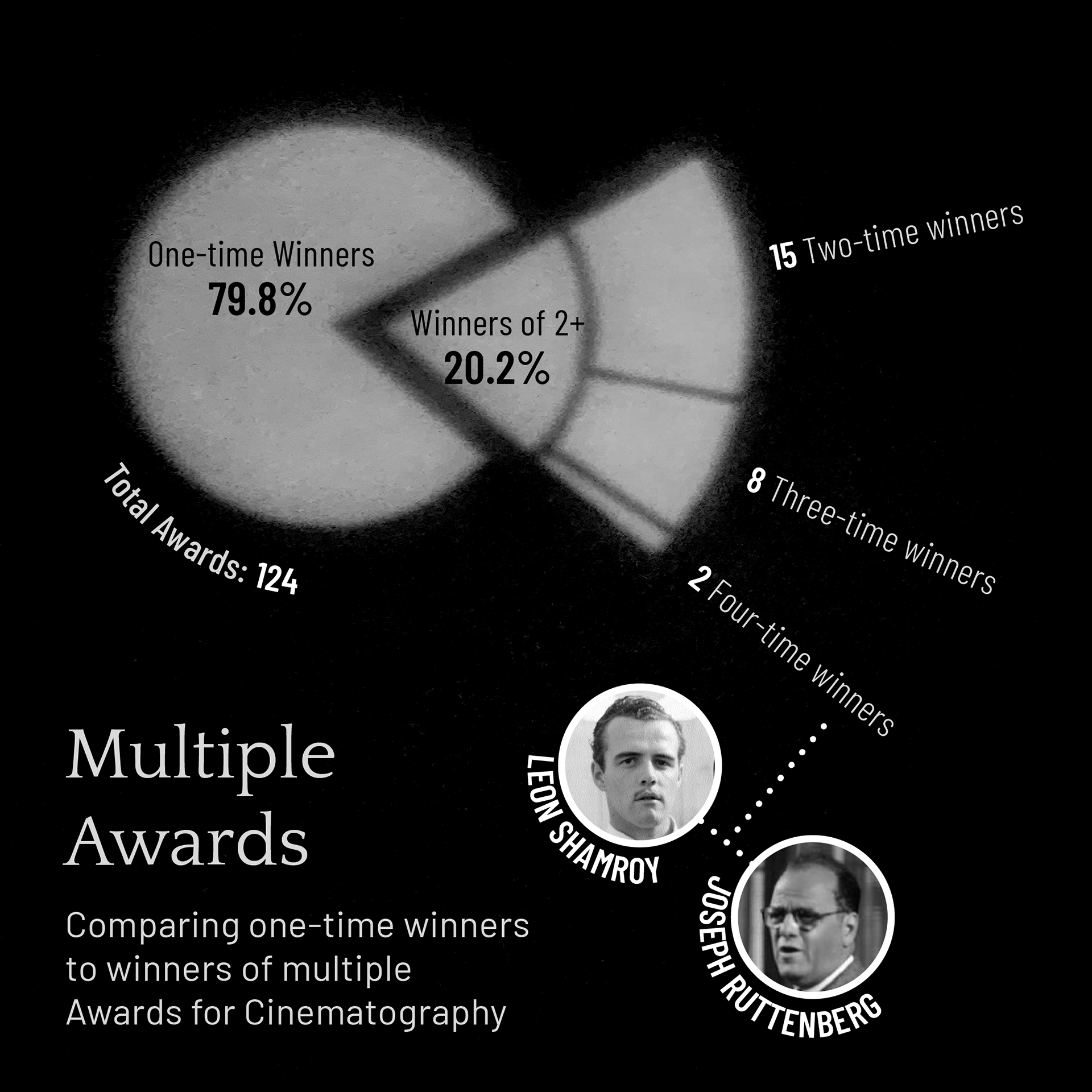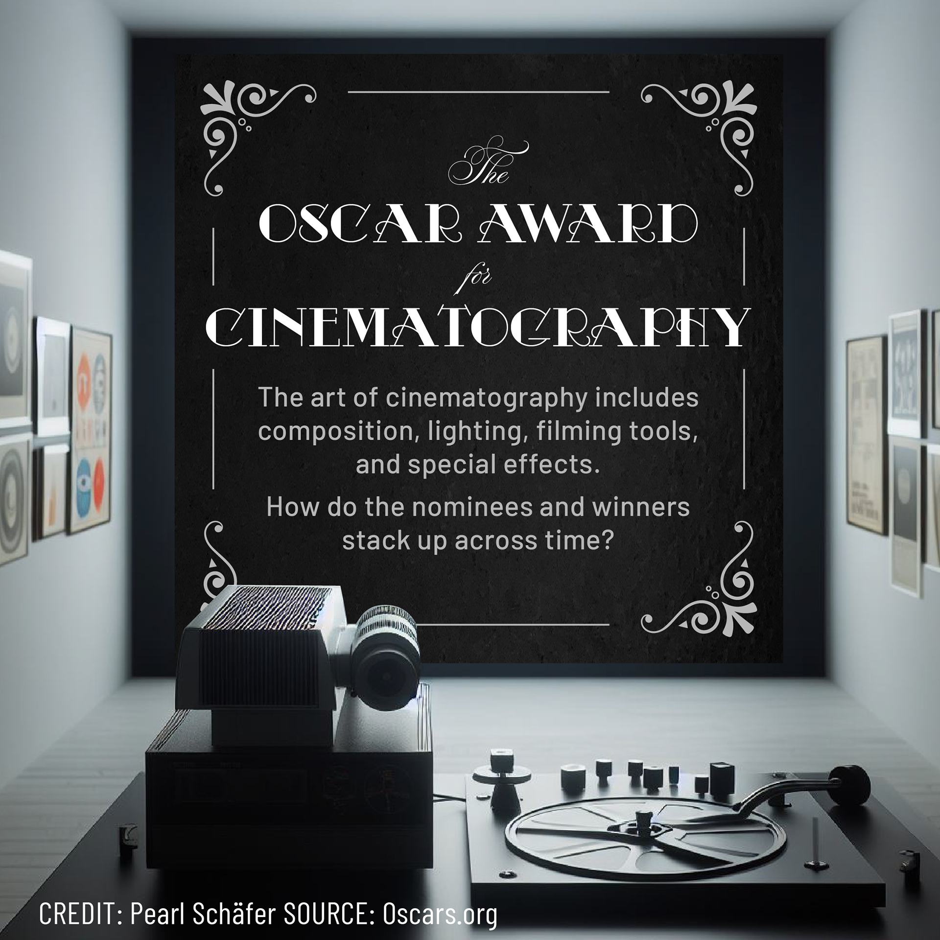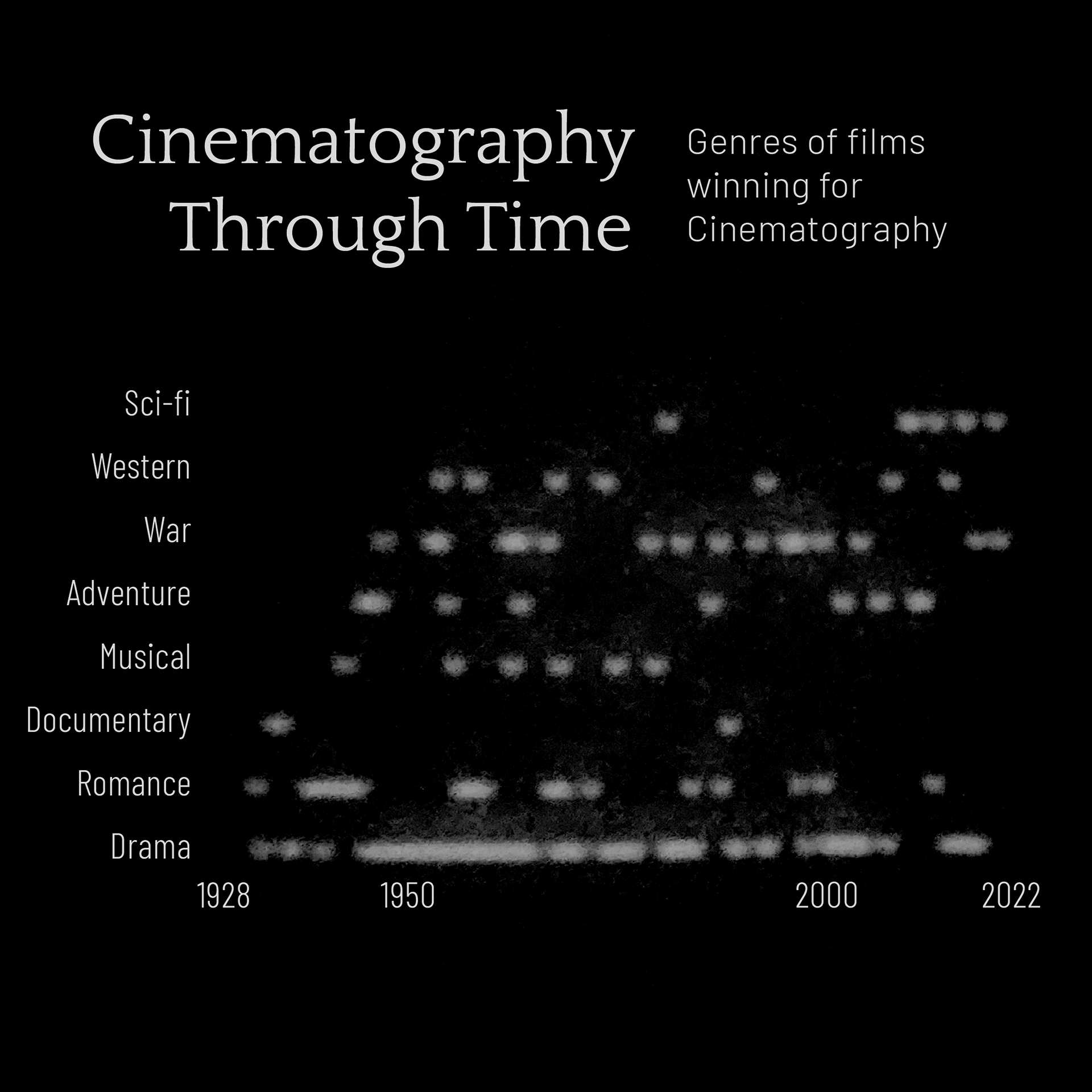 To relate to the topic of the Oscar Award for cinematography, I recreated my data sets by projecting light onto a wall: I first graphed the data in Illustrator, then printed it, cut it out, projected a light through it, photographed the projections, and implemented a photo treatment that alludes to the origins of early 20s filmmaking.