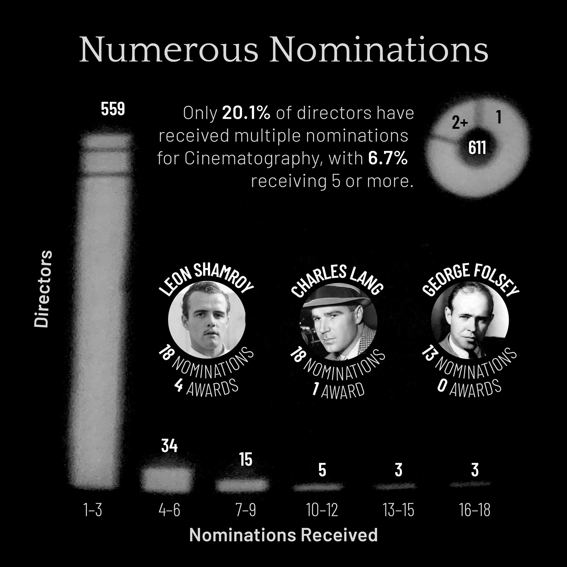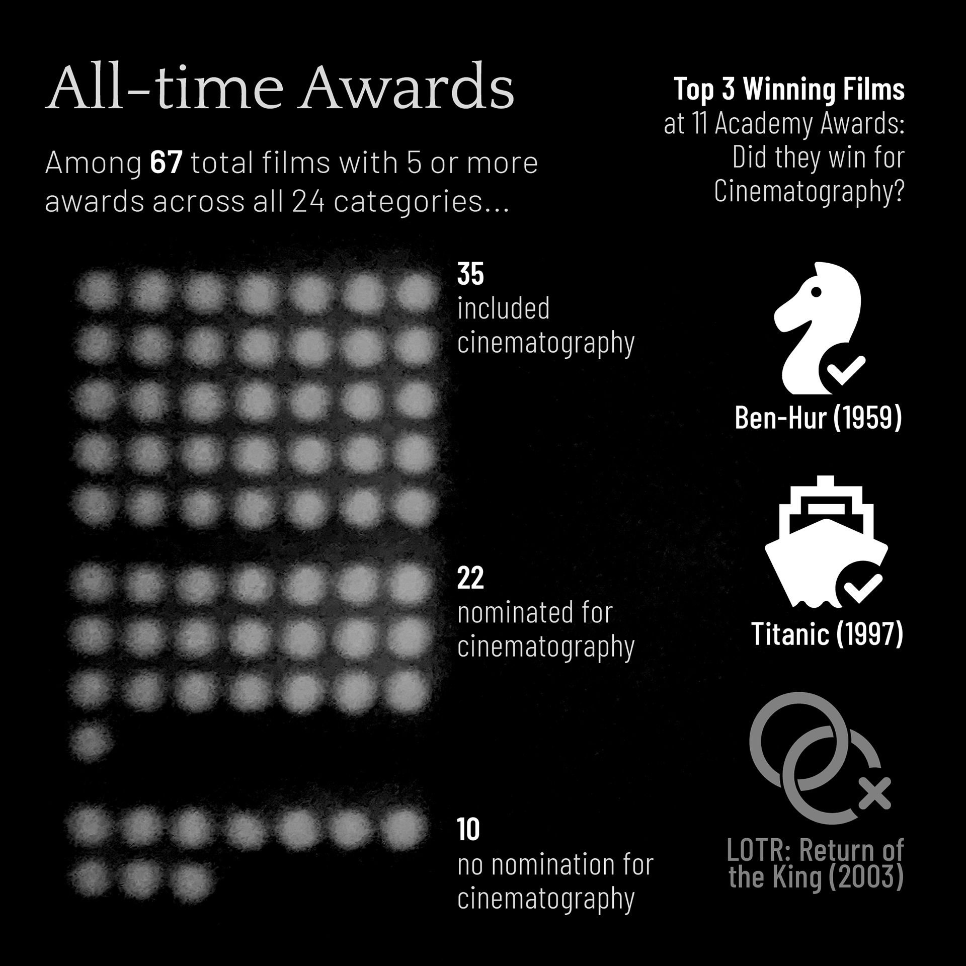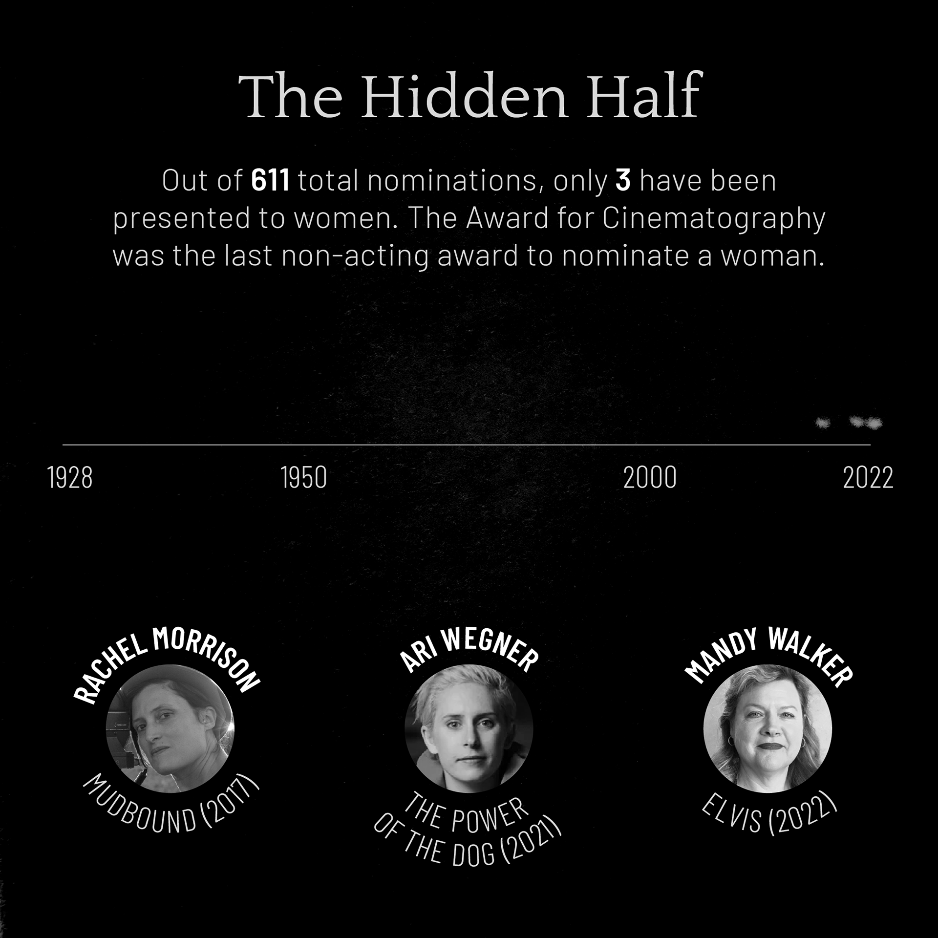 To relate to the topic of the Oscar Award for cinematography, I recreated my data sets by projecting light onto a wall: I first graphed the data in Illustrator, then printed it, cut it out, projected a light through it, photographed the projections, and implemented a photo treatment that alludes to the origins of early 20s filmmaking.