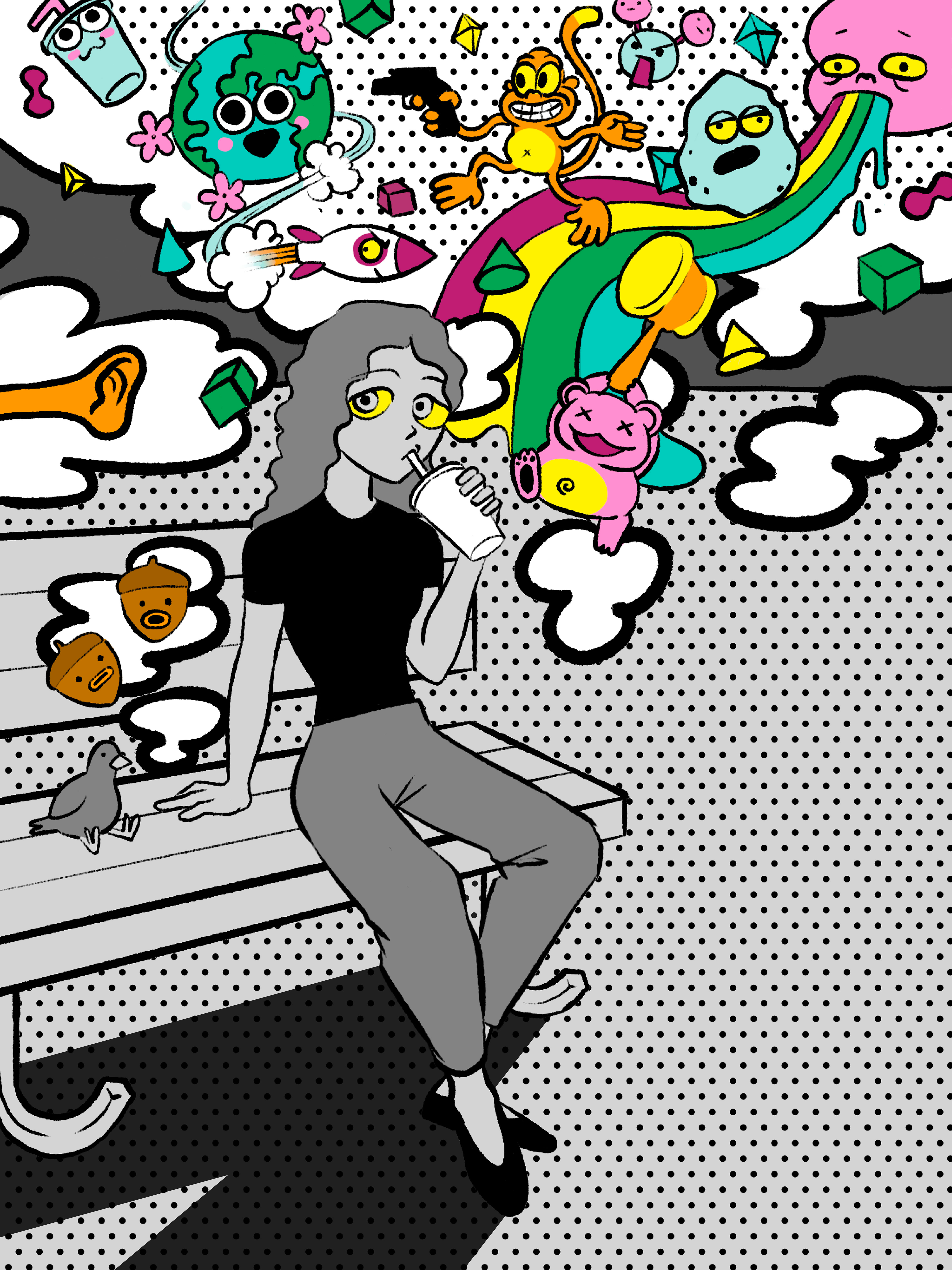The piece conveys my personal perspective by rendering daydreams in bright color and leaving the outside world nondescript. Spot textures allude to an interest in comics and graphic styles.