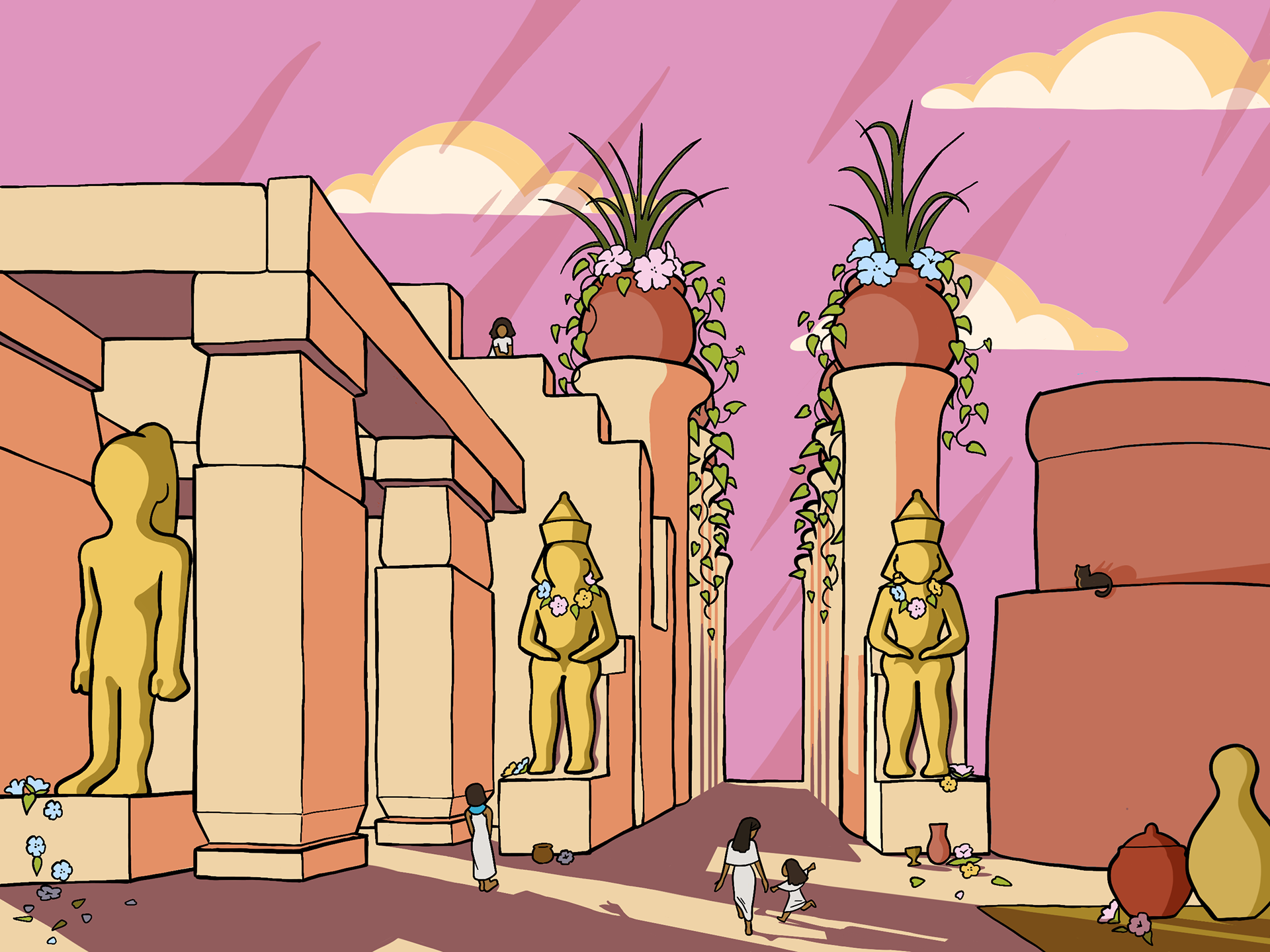I referenced a photo of ancient Egyptian ruins to imagine what the scene may look like if it still contained life. To romanticize this historical fiction, I paid attention to lighting, including the use of exaggerated shadows, the rendering of the sky, and the rosy color palette.