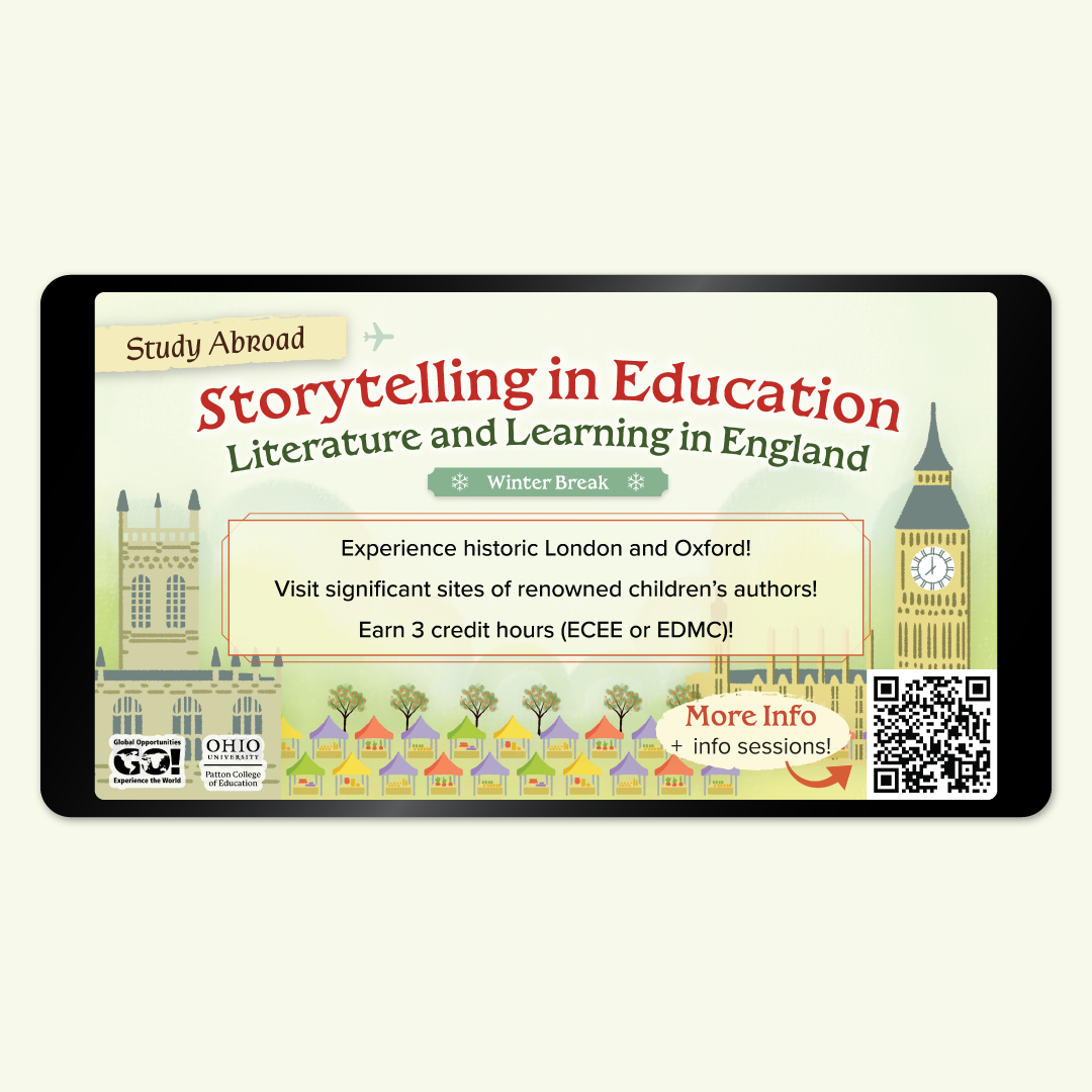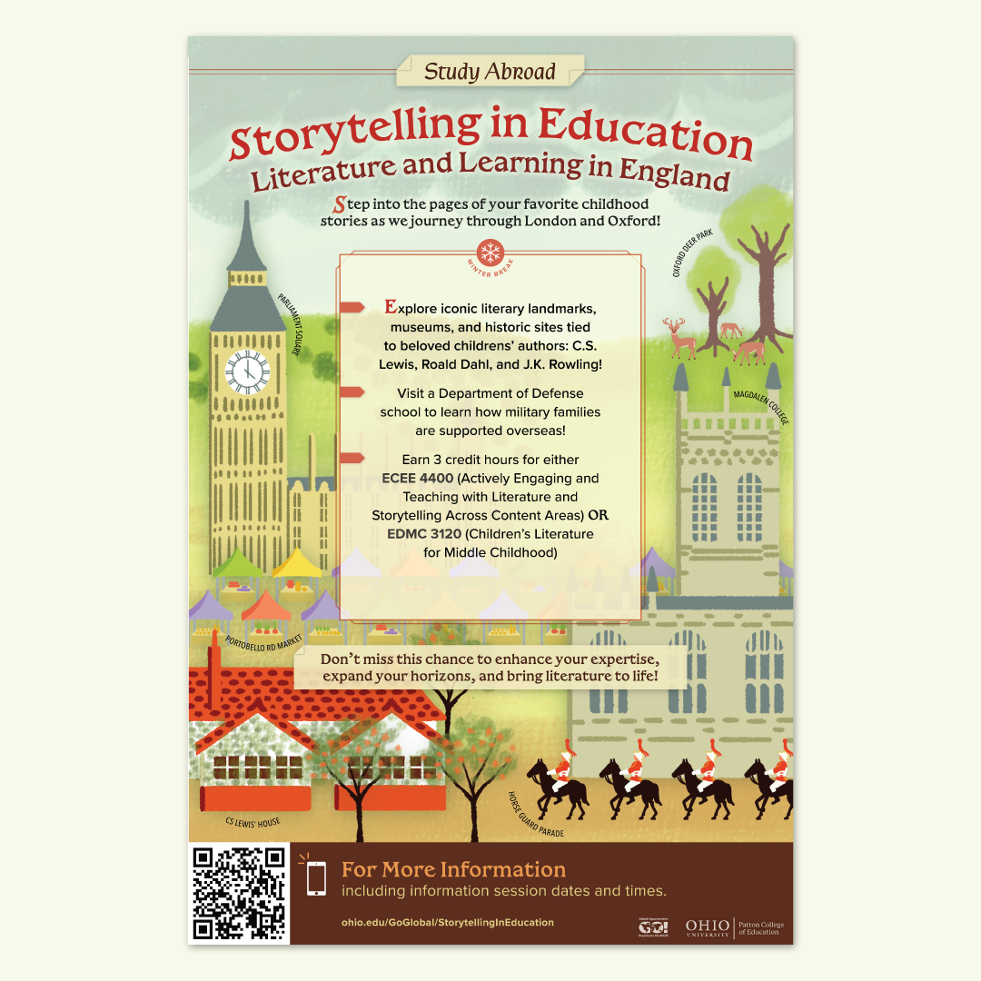 For each campaign, I conceptualized and executed unique visual themes based on the location and subject of the program with original raster illustrations, vector graphics, or digital collages. All print and digital signage was displayed around Ohio University's campus, including various conventions. By the end of my term, I also converted the Illustrator files to Canva files, which could be easily and indefinitely updated.