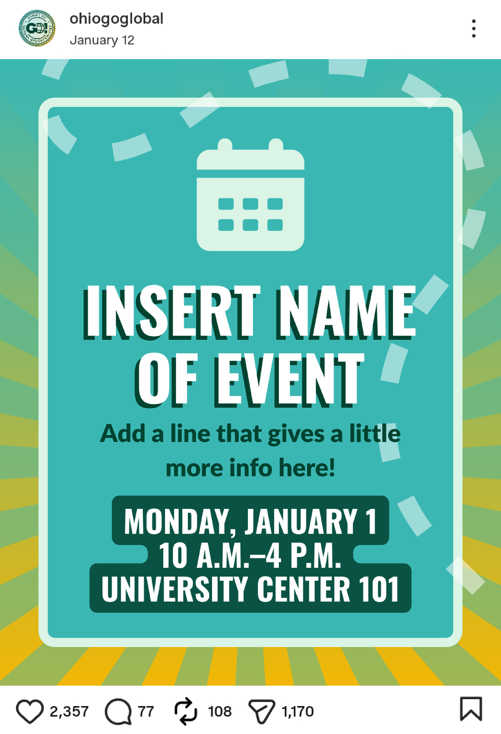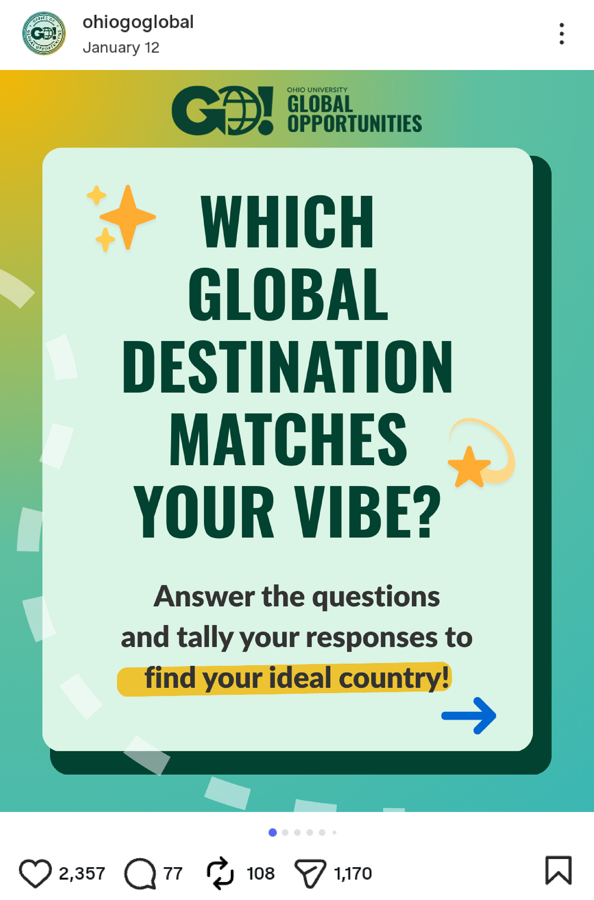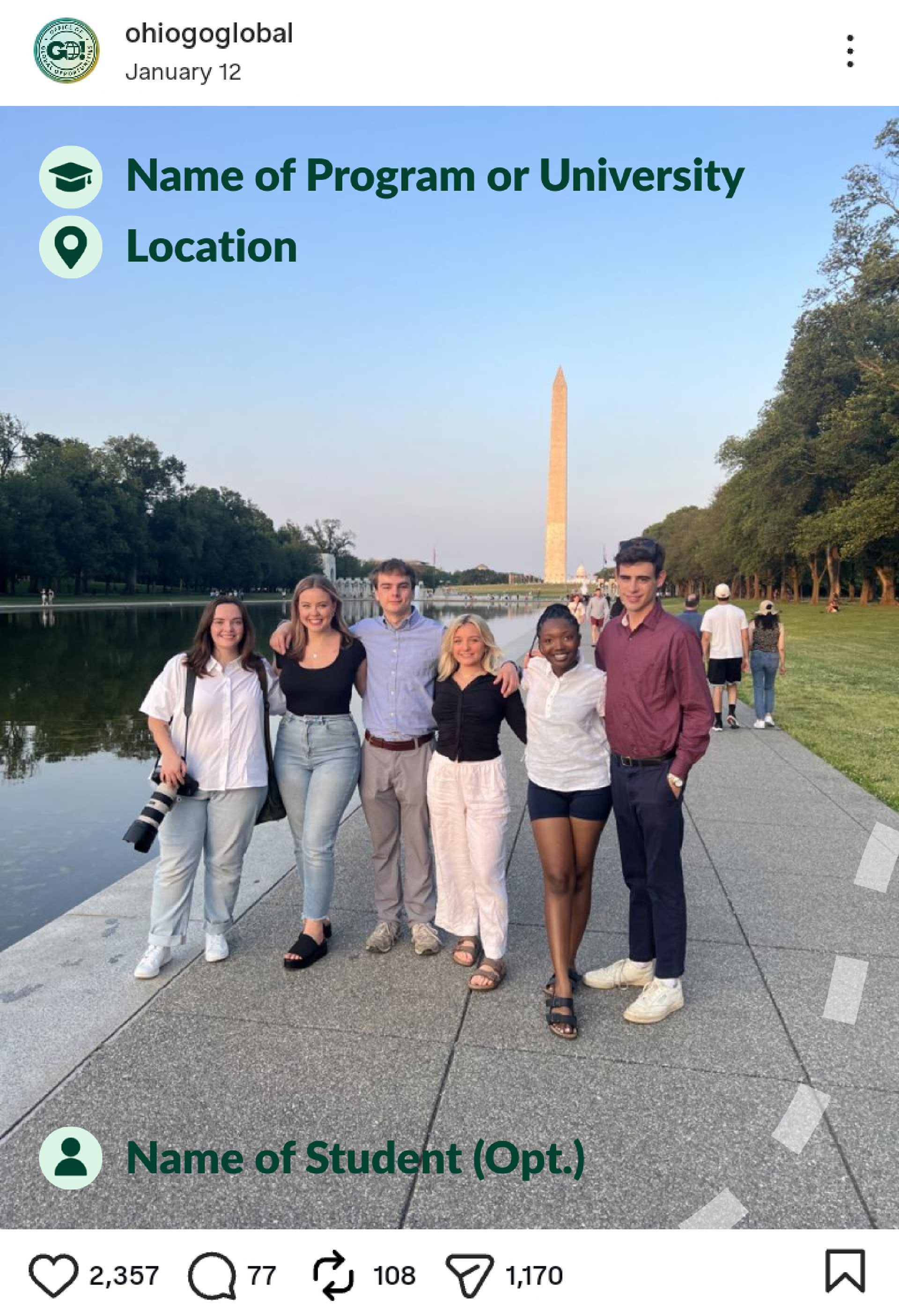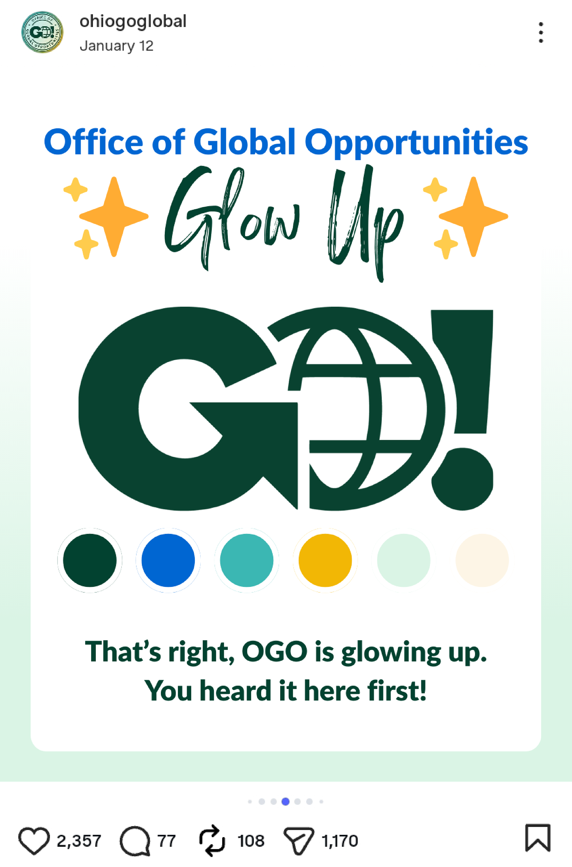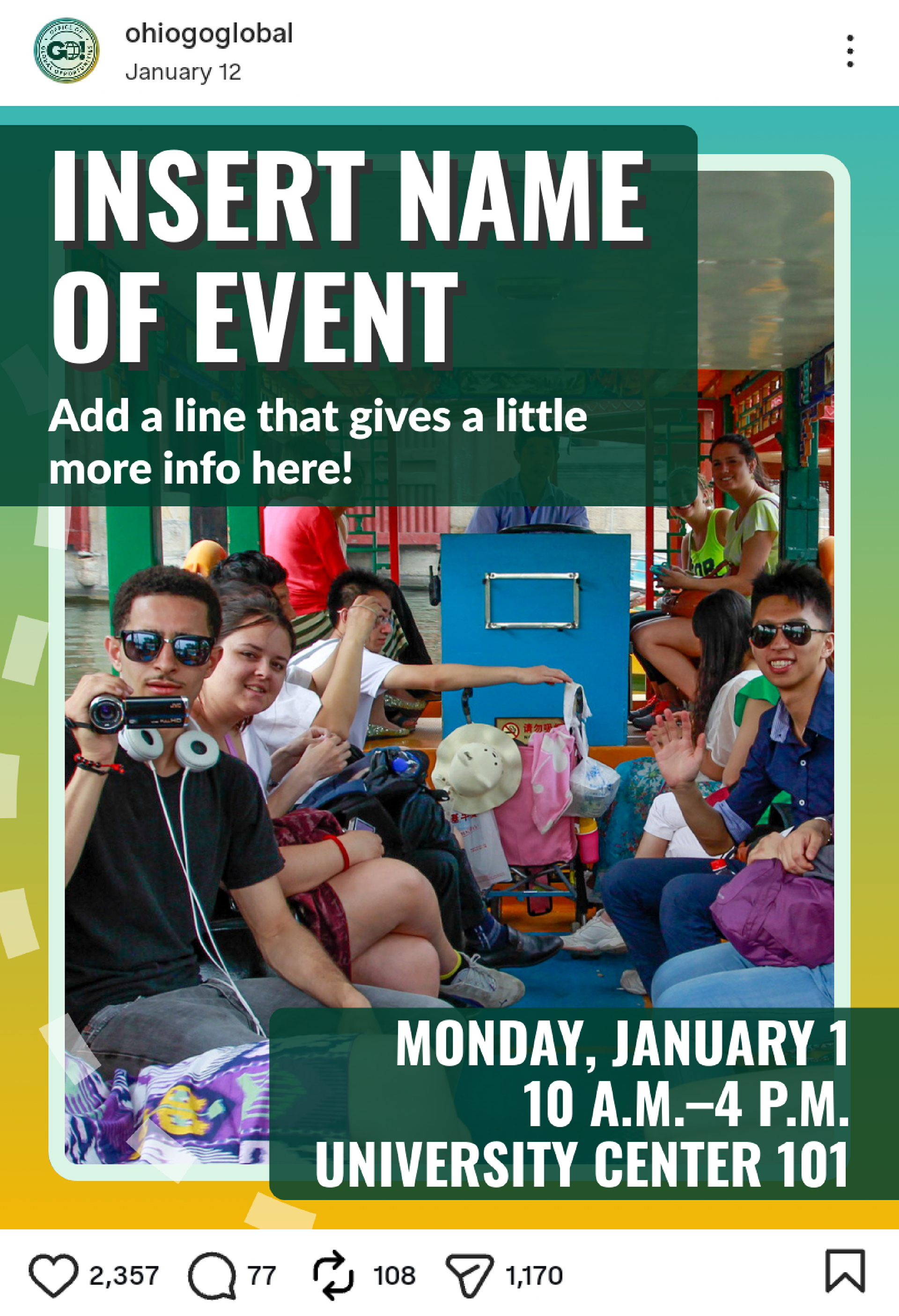 To increase interest in study abroad at Ohio University, OGO sought to establish both a visual identity and a consistent presence on social media. Provided with written content and a new set of brand standards, my task was to translate this new branding to Instagram posts and Facebook assets. The office also wanted templates which they could update and use indefinitely.