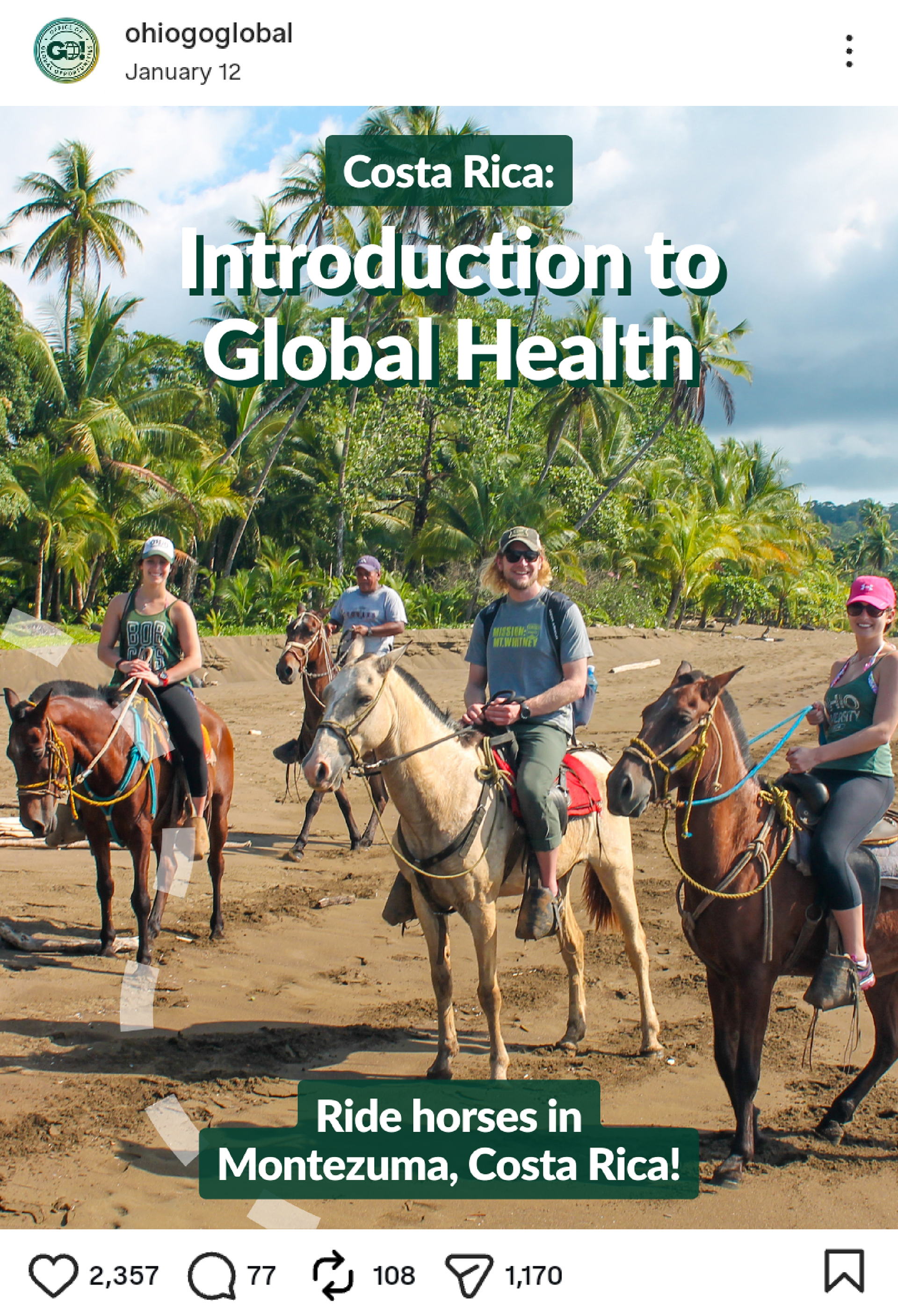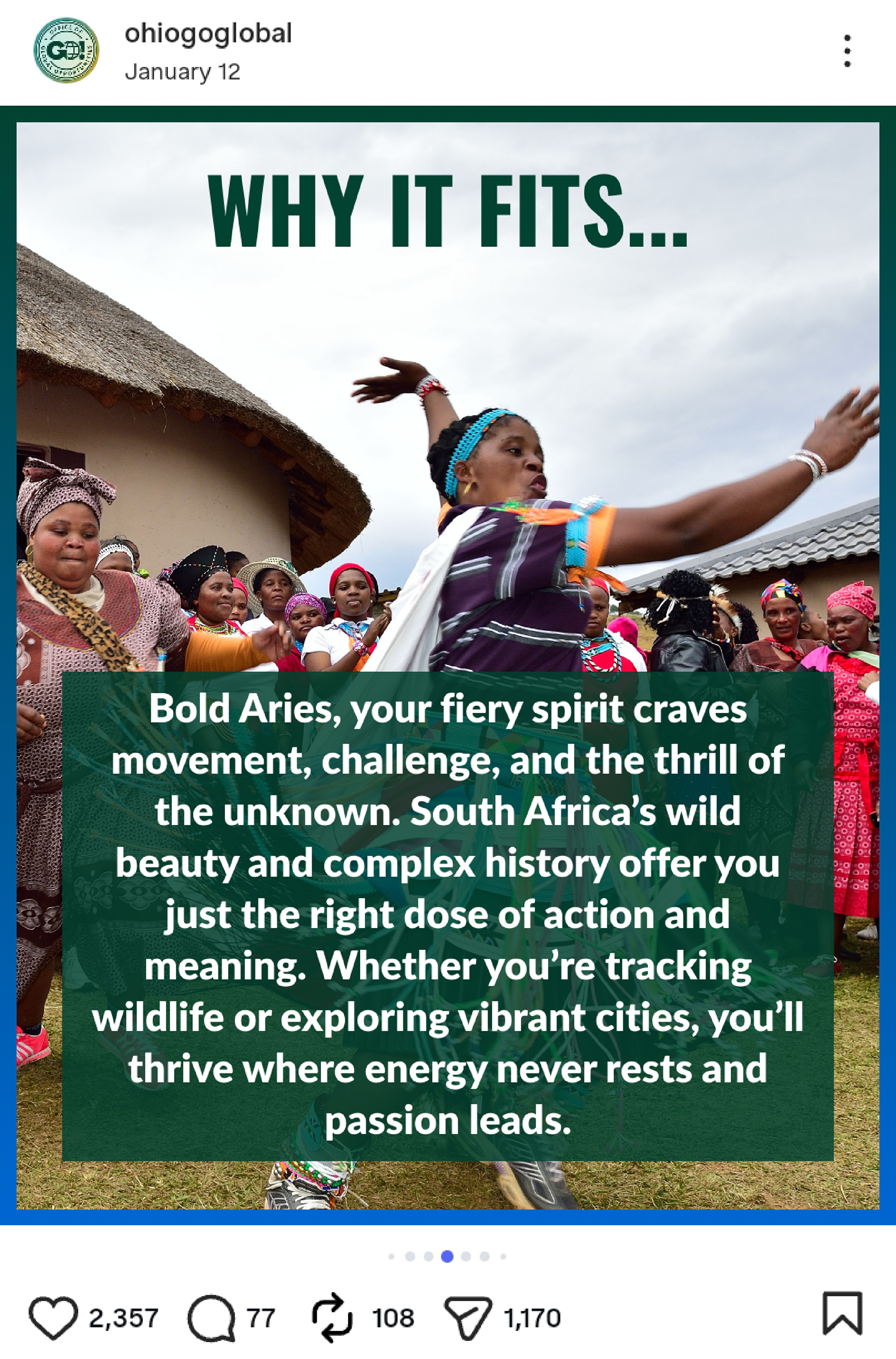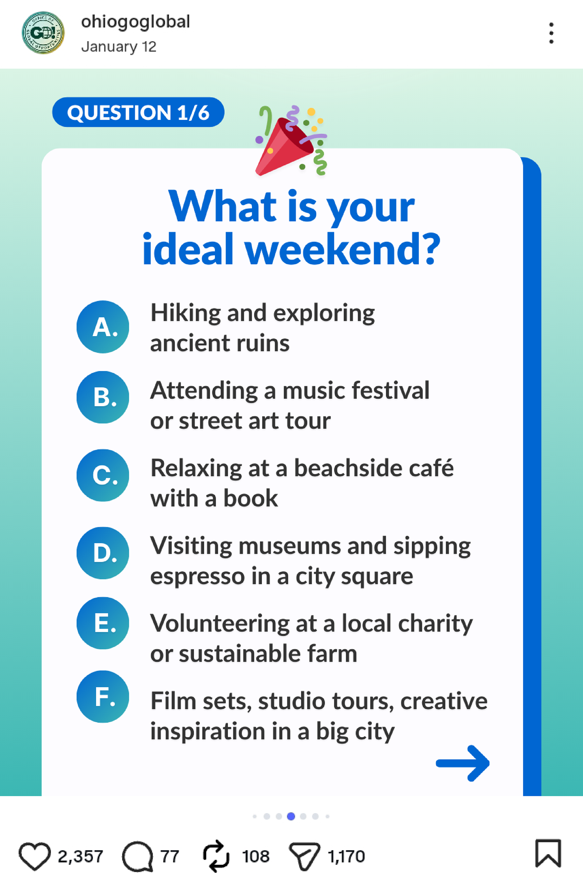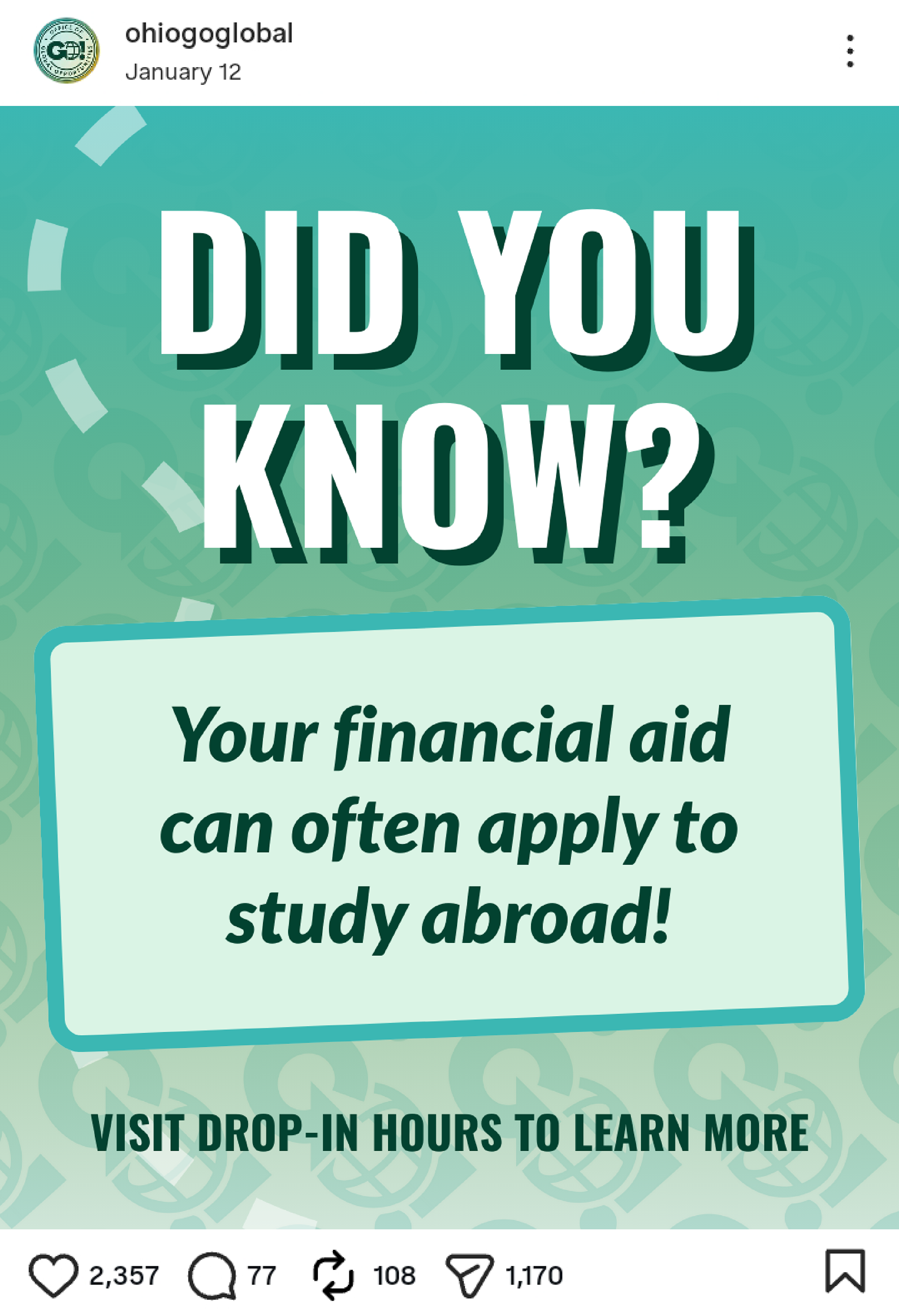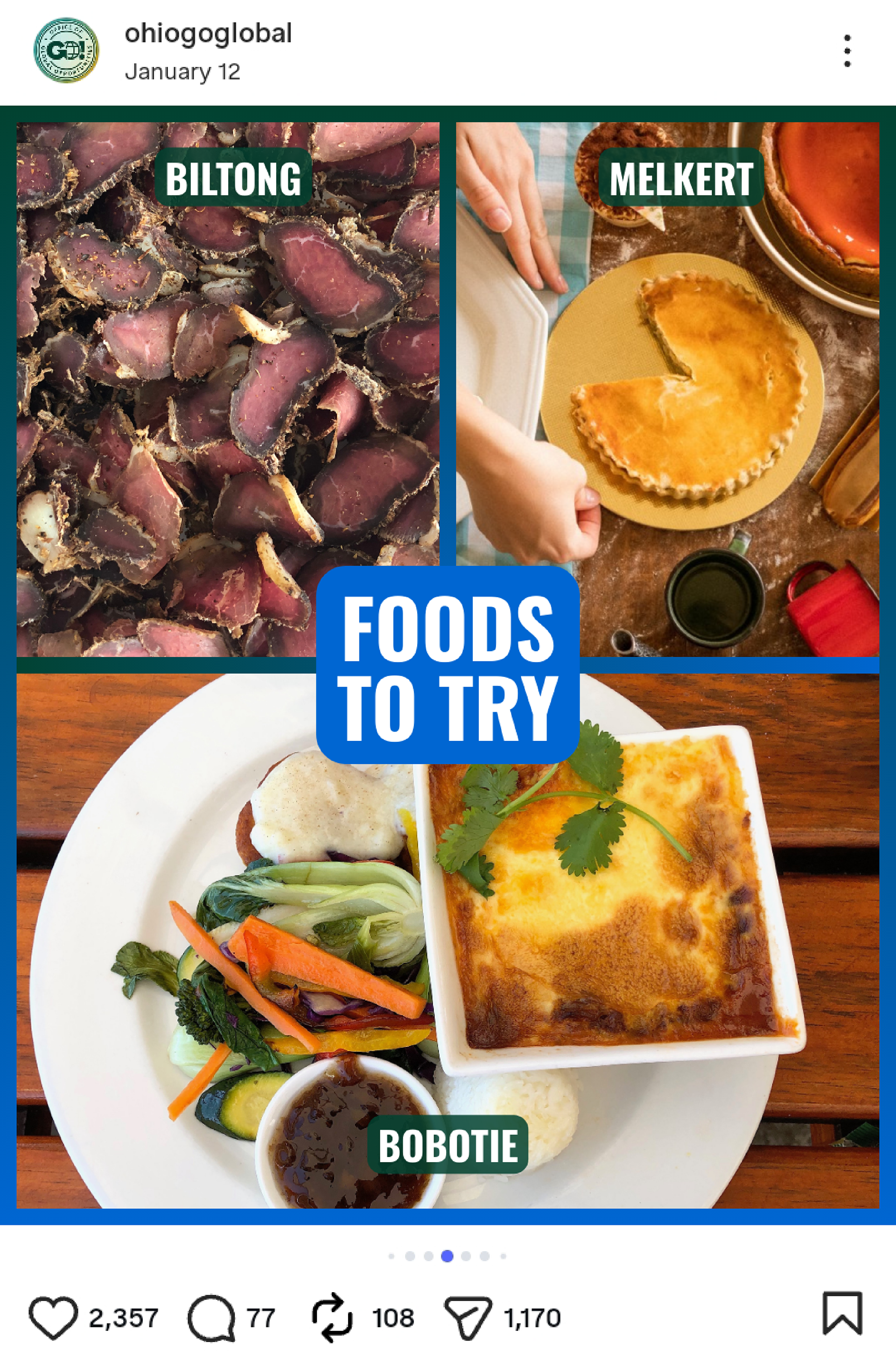 To increase interest in study abroad at Ohio University, OGO sought to establish both a visual identity and a consistent presence on social media. Provided with written content and a new set of brand standards, my task was to translate this new branding to Instagram posts and Facebook assets. The office also wanted templates which they could update and use indefinitely.