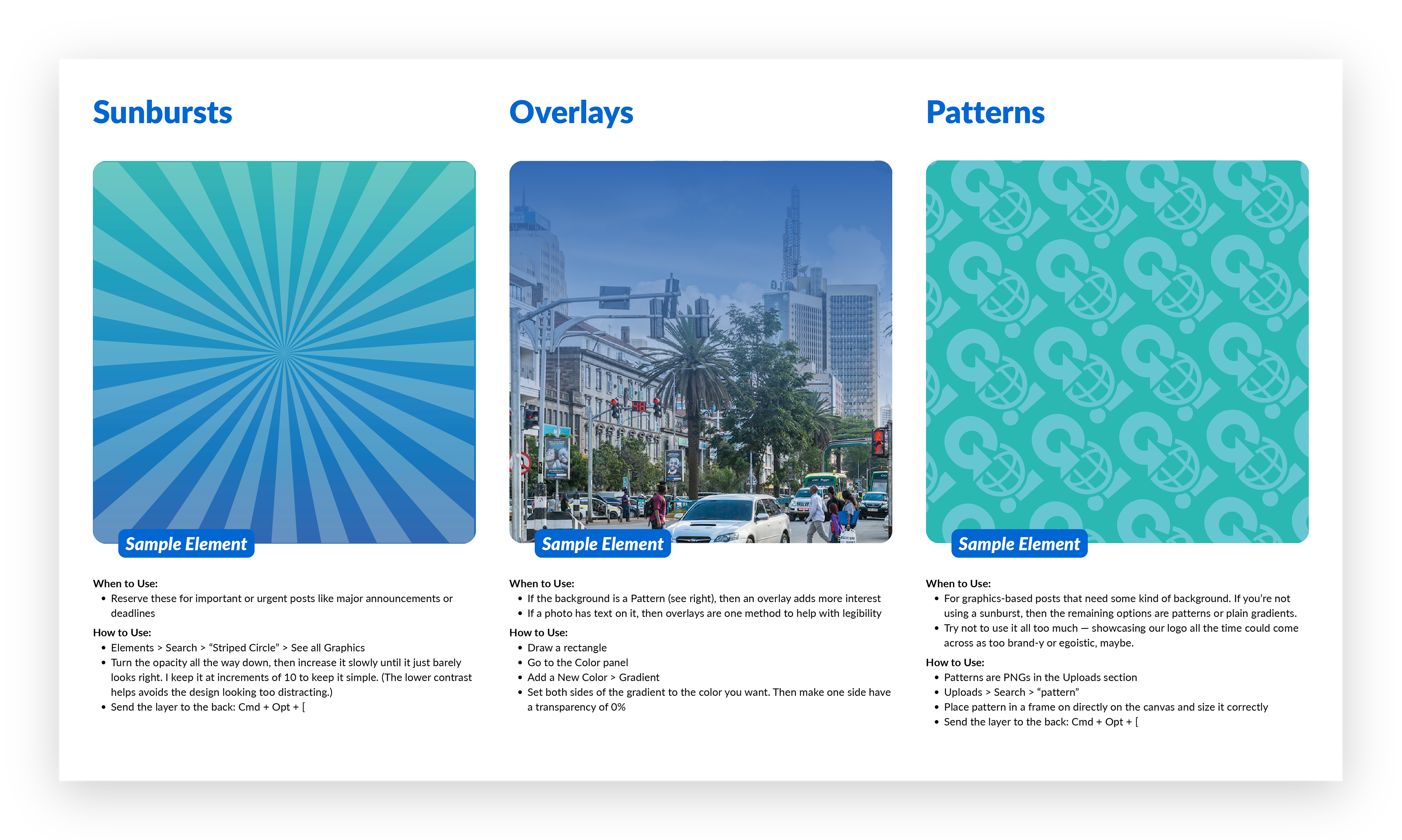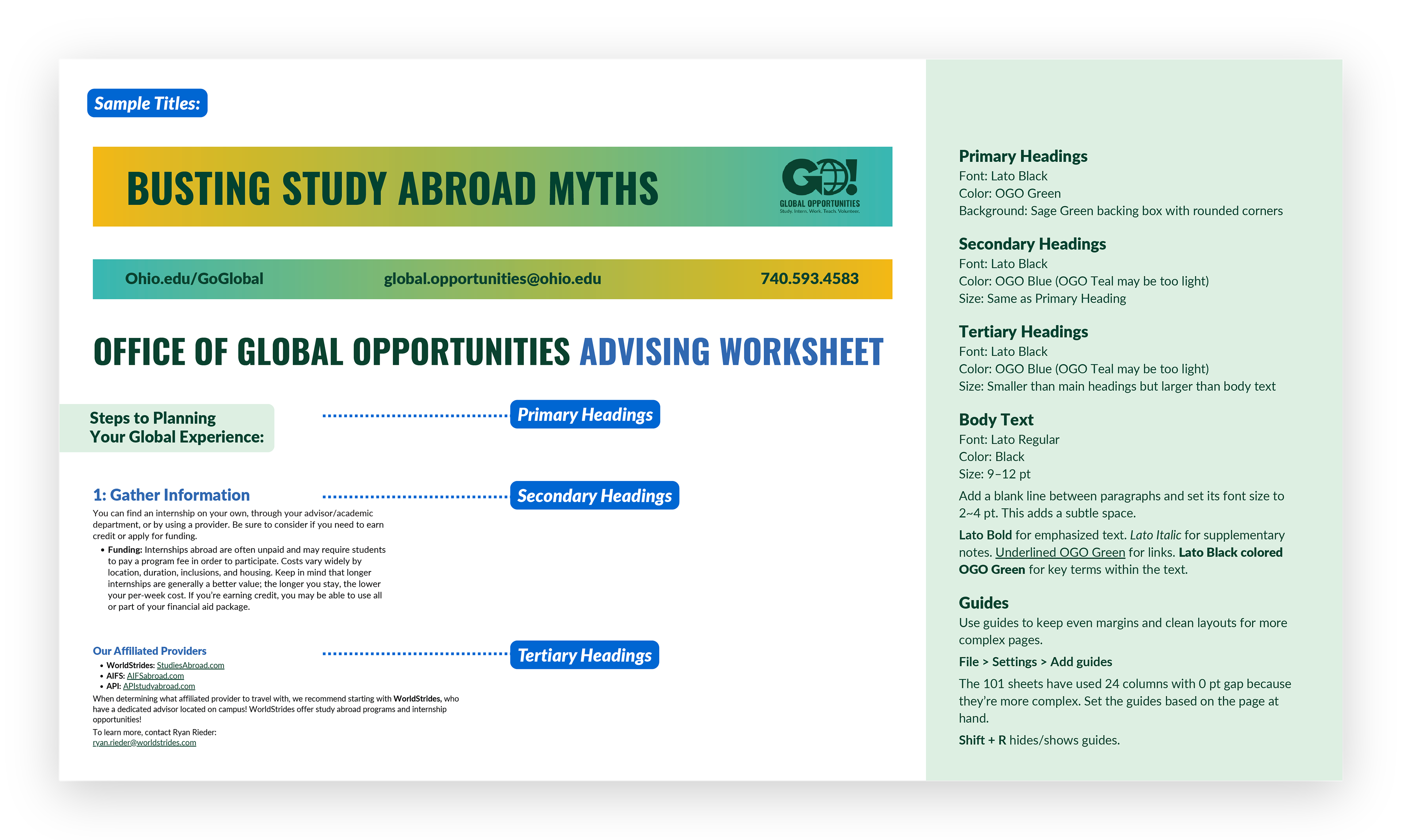 To help future team members apply OGO brand fonts and colors in context, I provided three guides: a graphics guide (explaining location and use of Canva graphics); a typography guide (explaining print and digital applications of the typefaces); and a template guide (a step-by-step guide to update Canva templates).