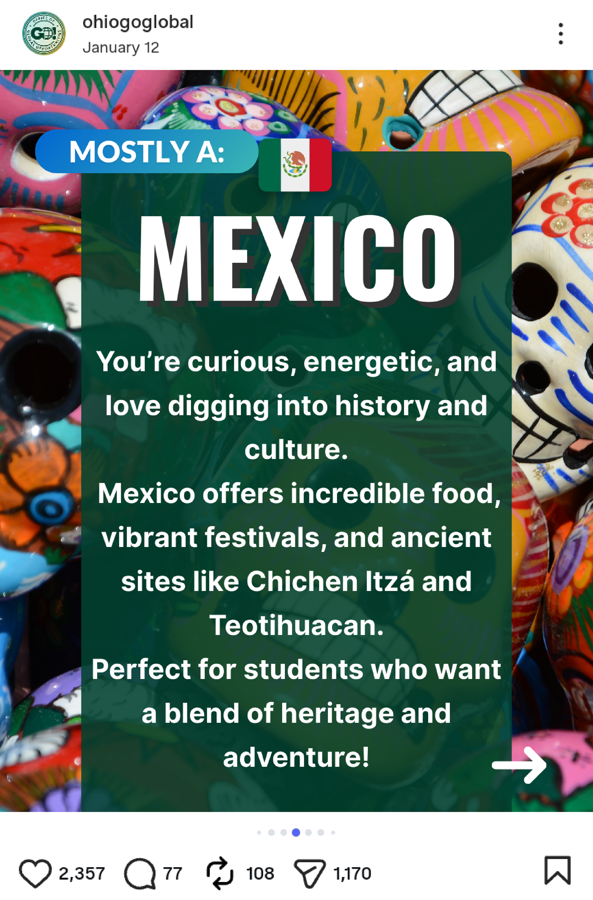 Our team developed "Where in the World Wednesday," a weekly campaign that invites followers to guess the location of photos submitted by students abroad.