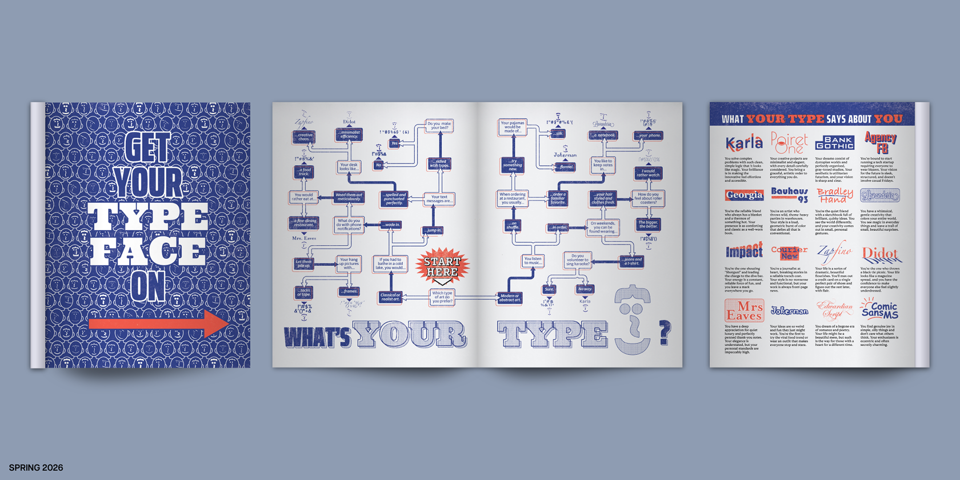 All interior pages appeared in the Spring 2026 issue of VIS Magazine. "What's Your Typeface?" was also deemed one of the top designs from the semester, selected by faculty from 72 total projects.