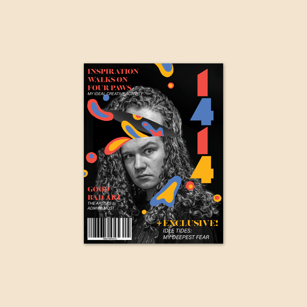 Design a magazine cover and three unique spreads for a fictional magazine called "1414." The content must be autobiographical.