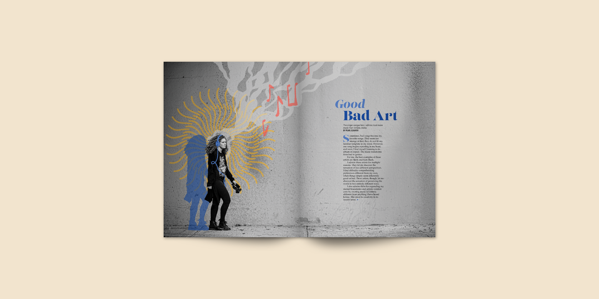 My task was to produce four interior pages along with a corresponding magazine cover through my own research, writing, and page design. As Associate Editor, I also helped art direct a staff portrait, and I formatted its final layout. All pages had to use standardized colors and typefaces.