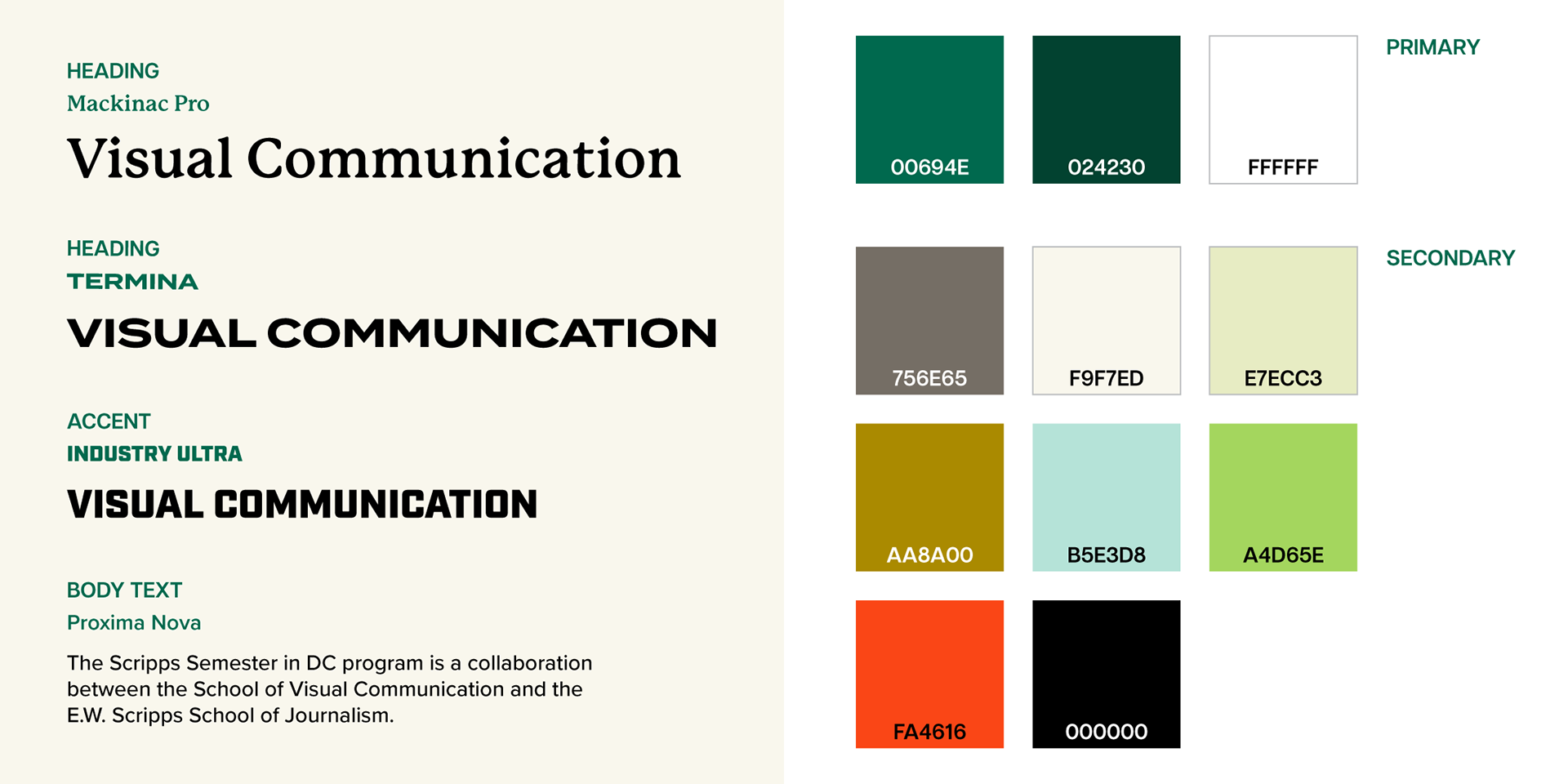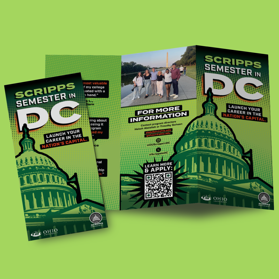Our approach appeals to tech-oriented students in the media school with bold colors and gritty textures. The system adheres to Ohio University colors and typography, rearranging their hierarchies for a fresh but recognizable identity.
