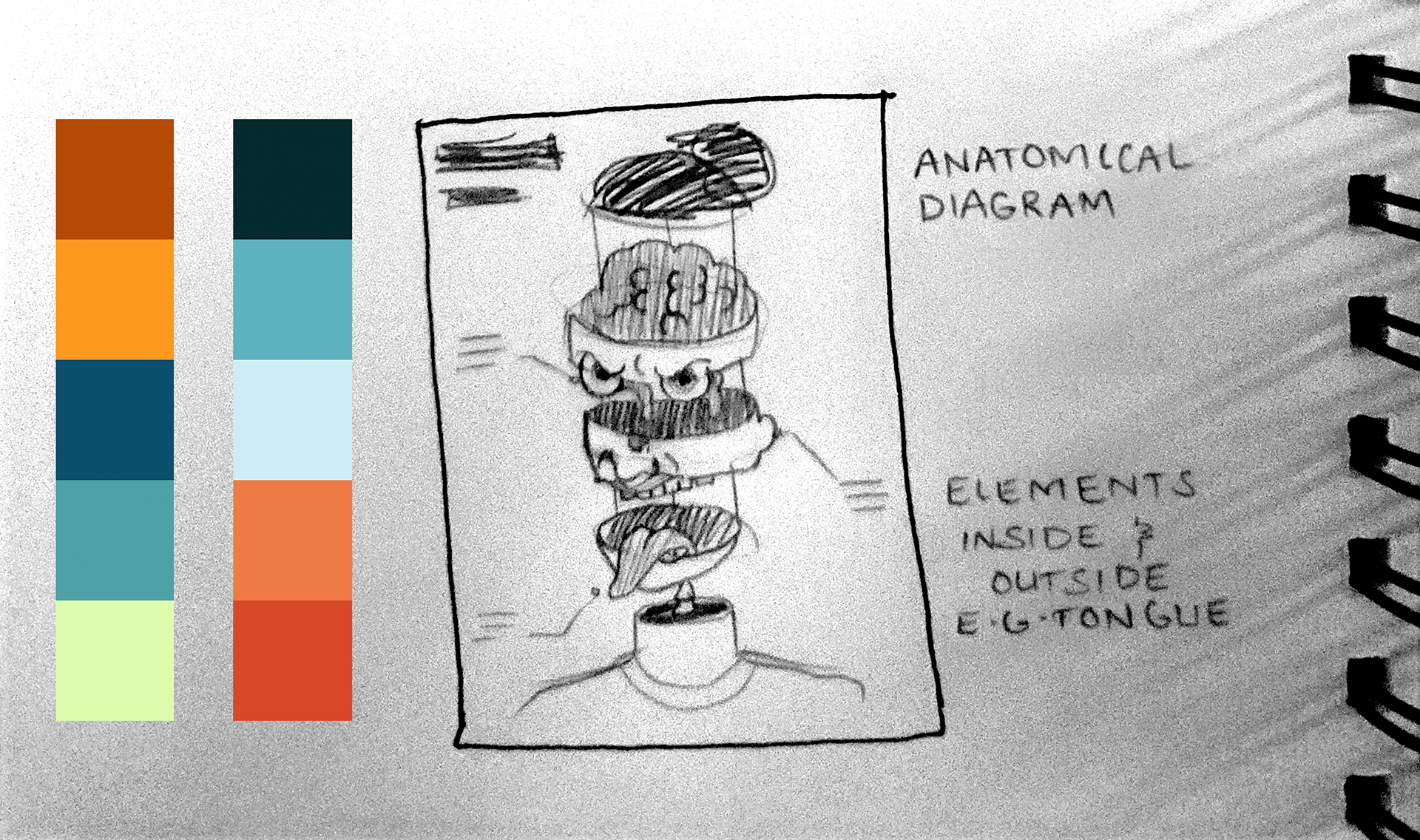 I began with a composition sketch accompanied by two potential color palettes.