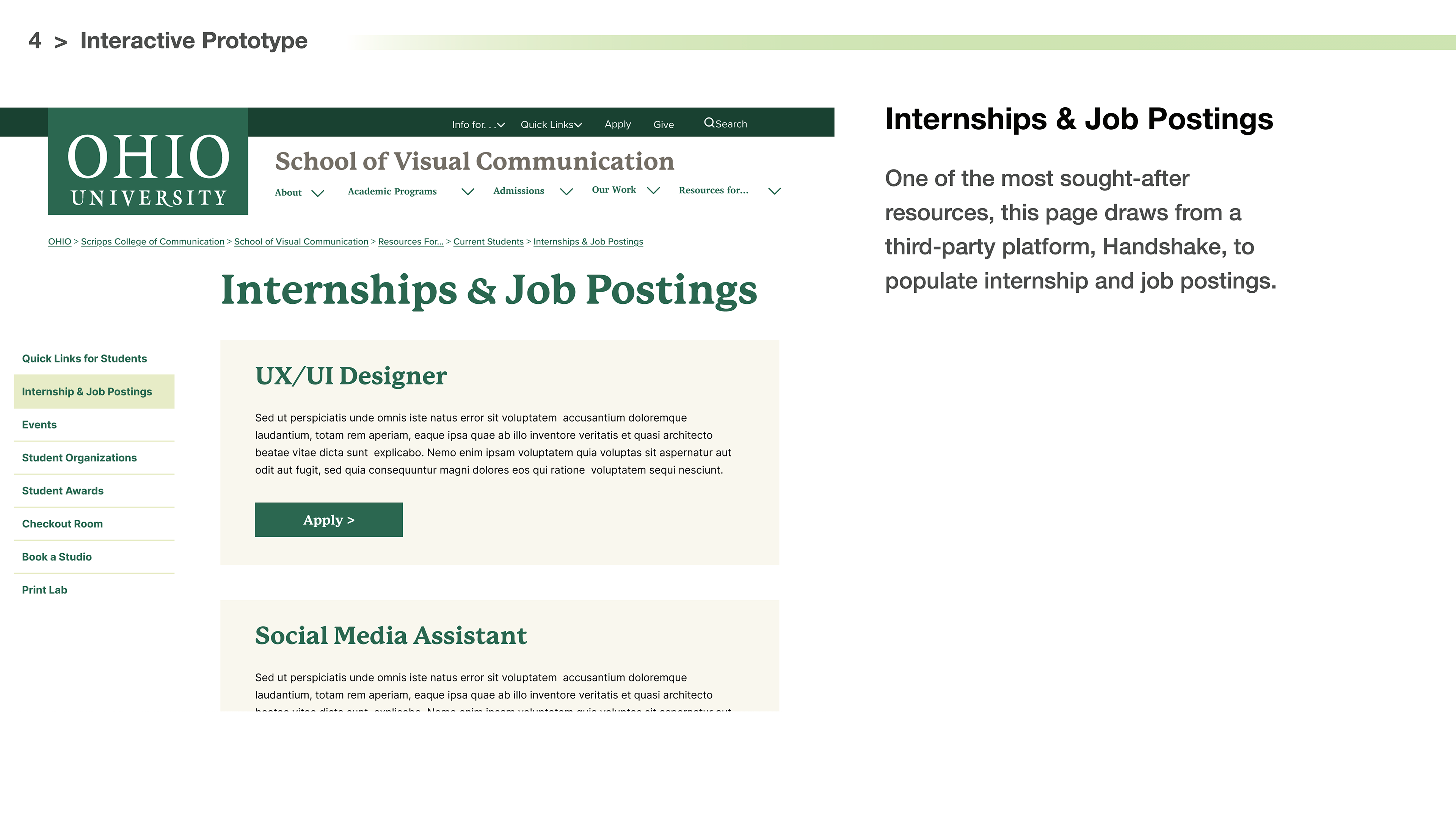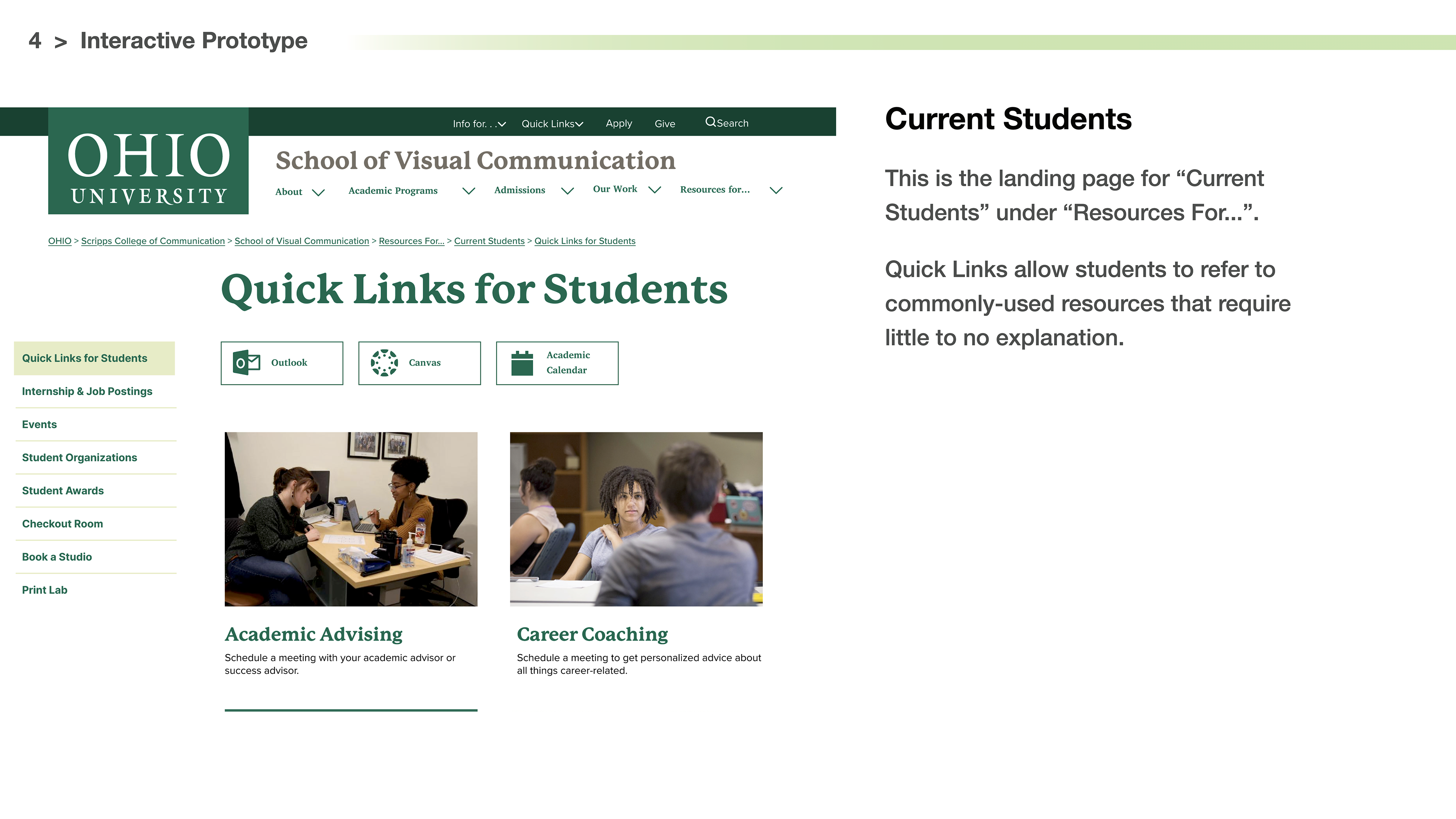 I designed the section “Resources for... > Current Students.” My goal was to design it as a interactive centralized hub designed for students wanting to connect with the school or find general information.